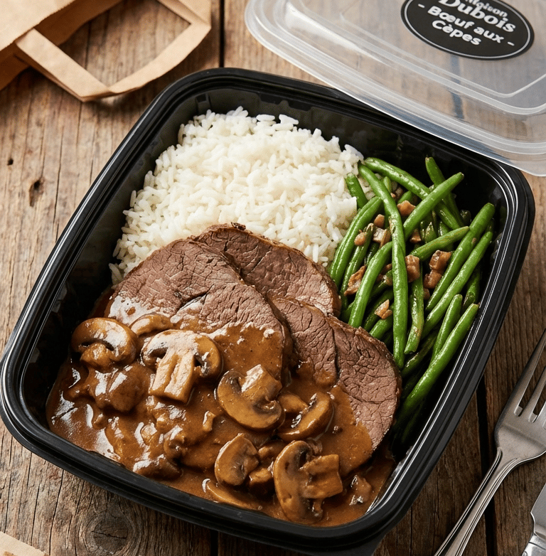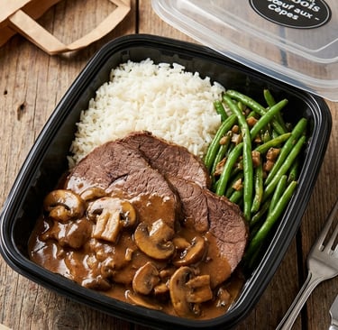 Mushroom sauce steak with green beans & rice